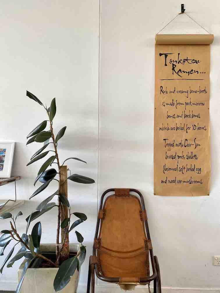 カフェのような雰囲気の店内で本格豚骨スープのラーメンやサイドディッシュなどを提供しています。